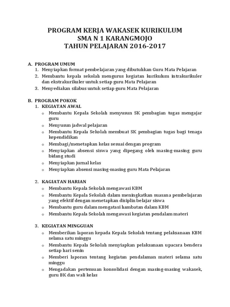 Penyusunan kalender pendidikan dan jadwal pelajaran . Program kerja wakasek kurikulum sma negeri 1 gununghalu disusun oleh : Merencanakan dan menyusun program pengembangan kurikulum. Membuat laporan pelaksanaan tugasnya ke kepala sekolah secara . Program kerja wakil kepala sekolah bidang kurikulum.